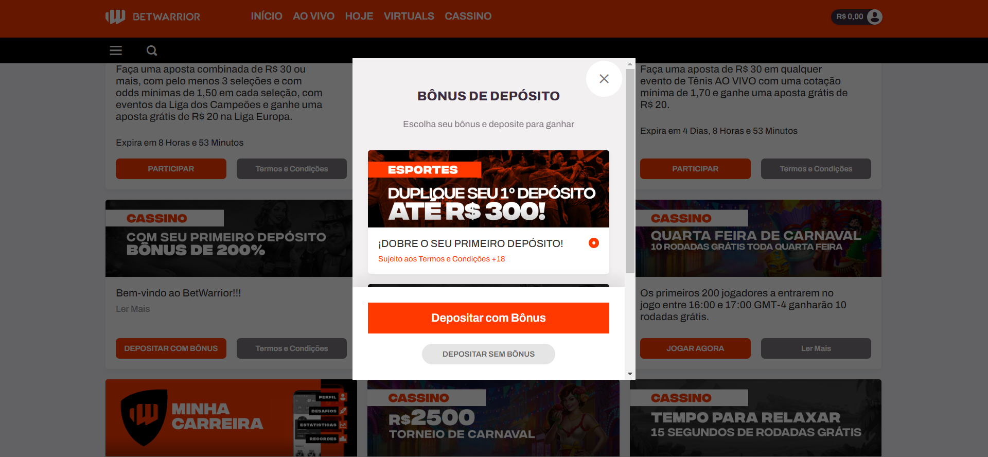 Essa oferta não exige nenhum código promocional BetWarrior. Basta selecioná-la no momento do seu 1º depósito e fazer um depósito mínimo qualificado para que a promoção seja ativada em sua conta.