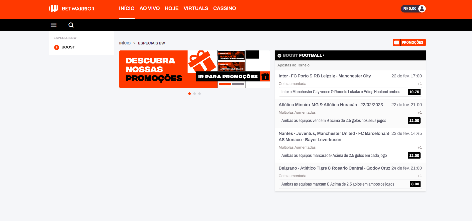 A seção de Especiais da BW é uma área da BetWarrior esportes que tem alguns eventos selecionados por essa casa de apostas, os quais facilitam a sua aposta. Nós encontramos, por exemplo, cotas aumentadas para jogos da Liga dos Campeões.