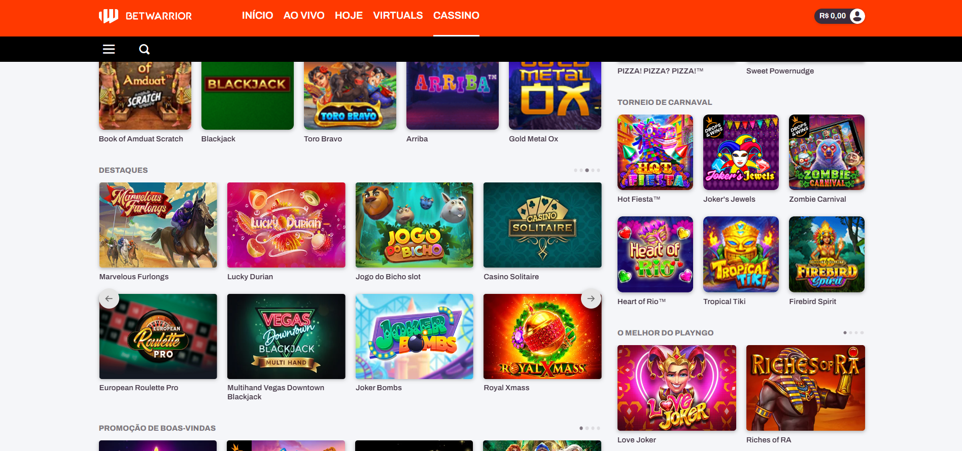 Apesar de não ter filtros que facilitam encontrar os jogos, ou categorias específicas para cada tipo de jogo, o BetWarrior casino tem algumas subseções que permitem que você encontre mais rapidamente o jogo de sua preferência.
