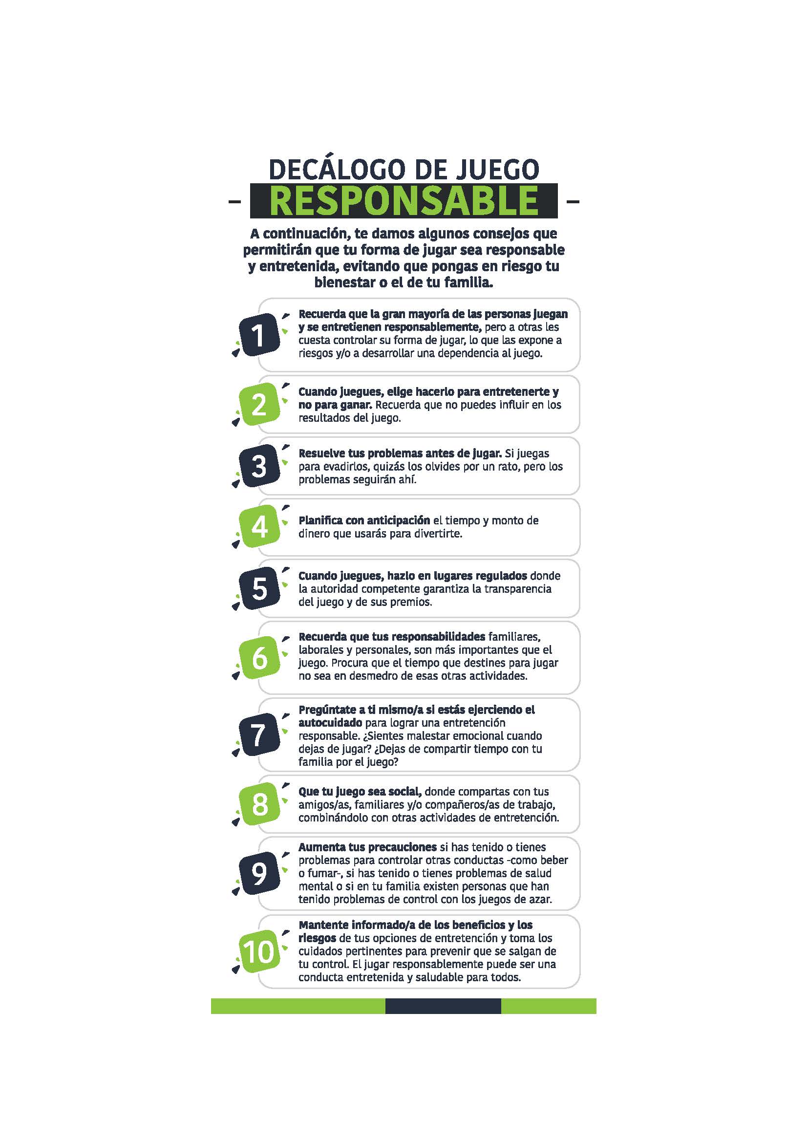 Jugar y apostar es una forma de entretenimiento, igual que ir al cine o salir a cenar. Piensa en el dinero que gastas apostando como una forma de diversión, nunca de inversión. Planifica tu presupuesto antes de comenzar a jugar y evita apostar cuando estás triste o muy contento. Nunca juegues más de lo que puedes permitirte perder, y no trates de recuperar el dinero perdido al apostar con una nueva apuesta.